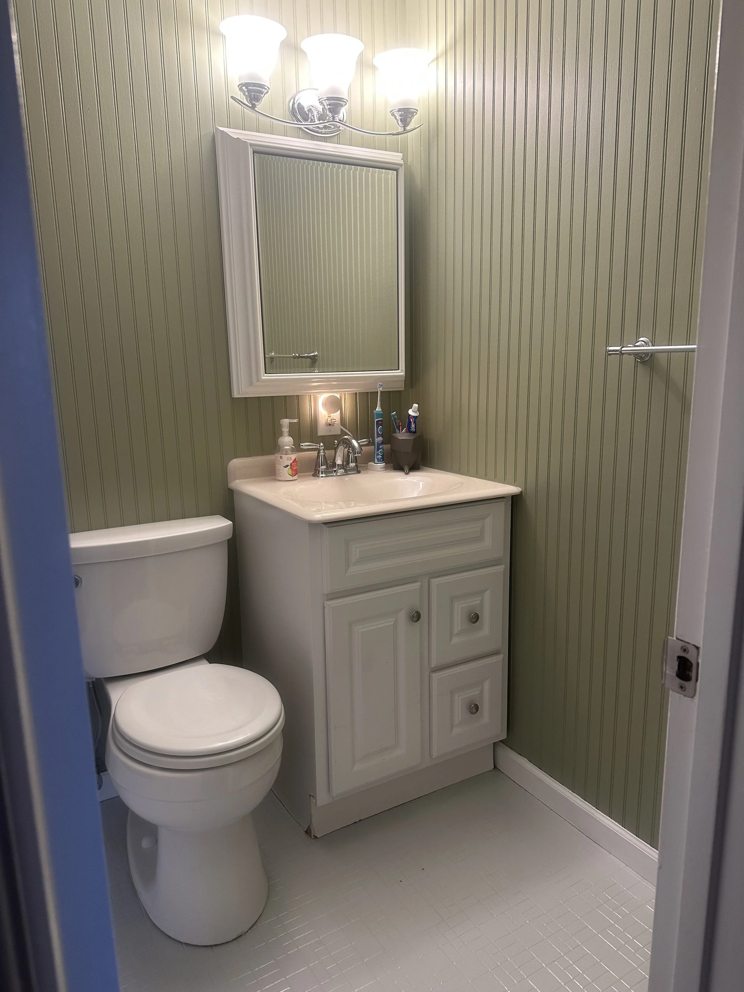 The floor looked much better, but the Pearl Gray color didn’t look good with the walls. I went to spend time at The Home Depot in the paint department. After bringing home several samples, I chose Meditation Time, a mid-range olive color. Since the bathroom is small, it took no time at all to tape and paint the walls. Ultimately, the new color made the room look much taller.